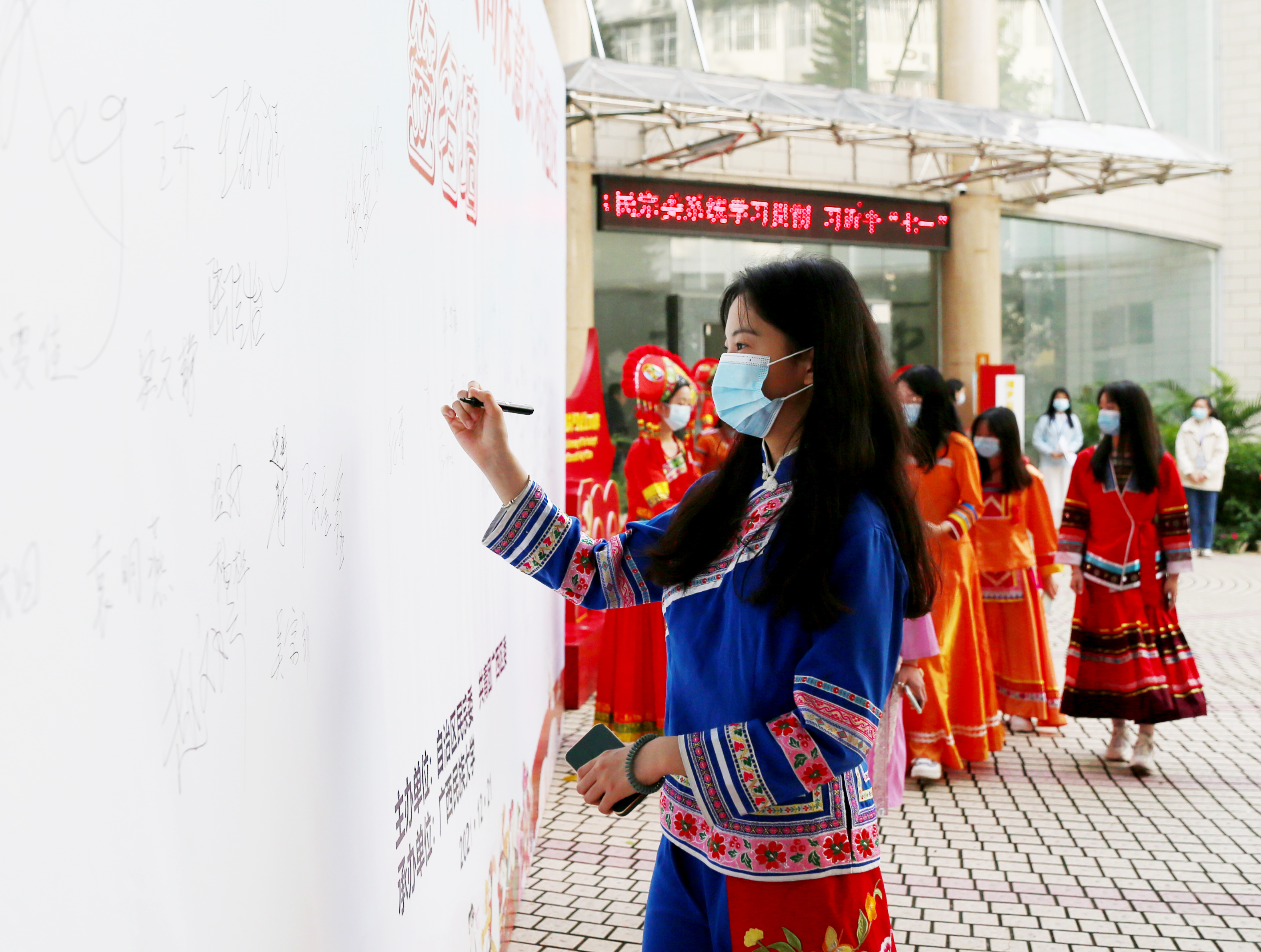 12月21日上午,在广西民族大学科技楼报告厅前,身着各民族服装的青年大学生朝气蓬勃、精神振奋,纷纷在“建设铸牢中华民族共同体意识示范区”签名墙上签名。报告厅内,自治区民宗委与共青团广西区委共同开展铸牢中华民族共同体意识示范创建签约仪式,现场气氛热烈,拉开了广西百万各族青少年投身铸牢中华民族共同体意识宣传教育活动的序幕。