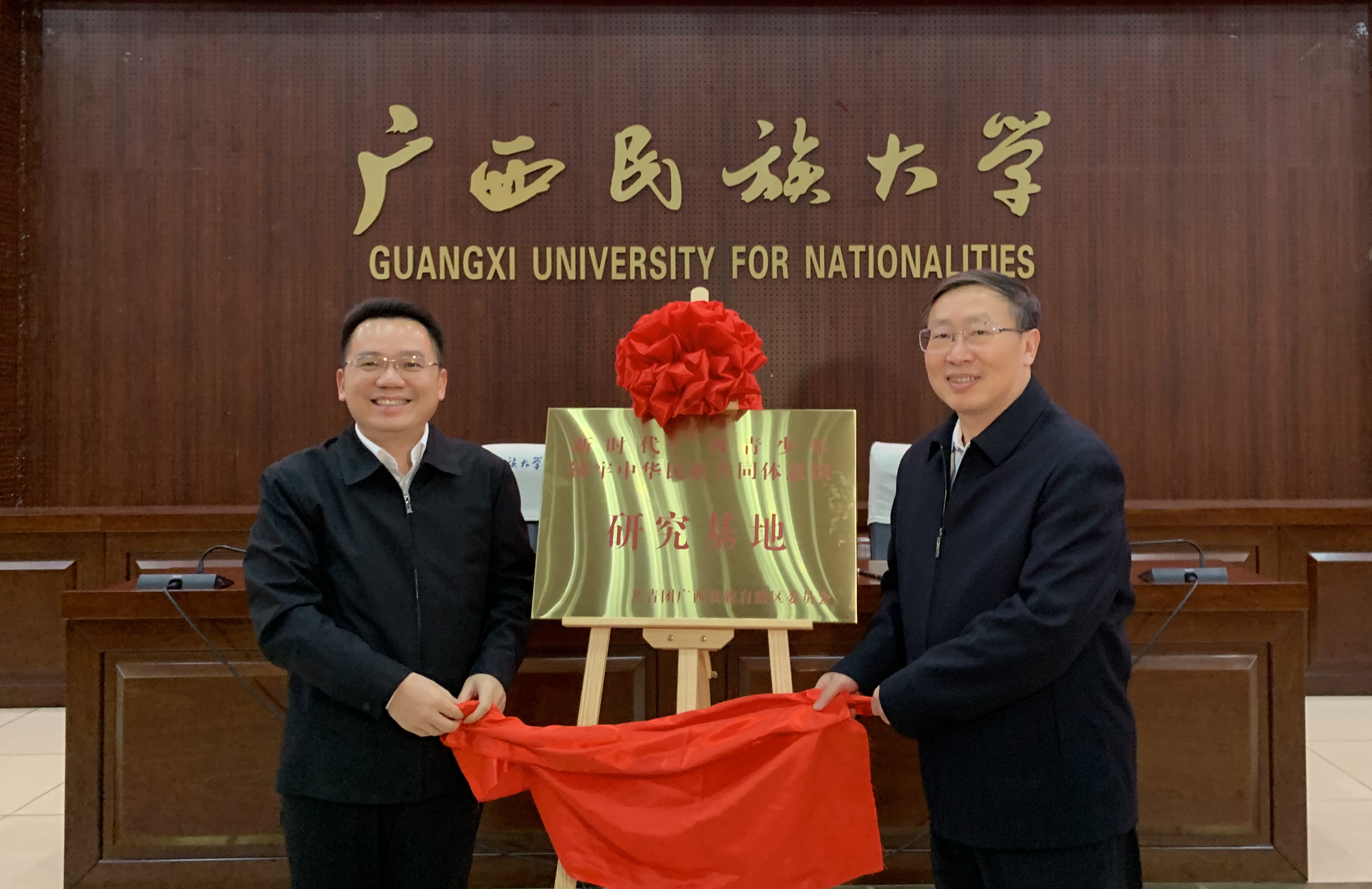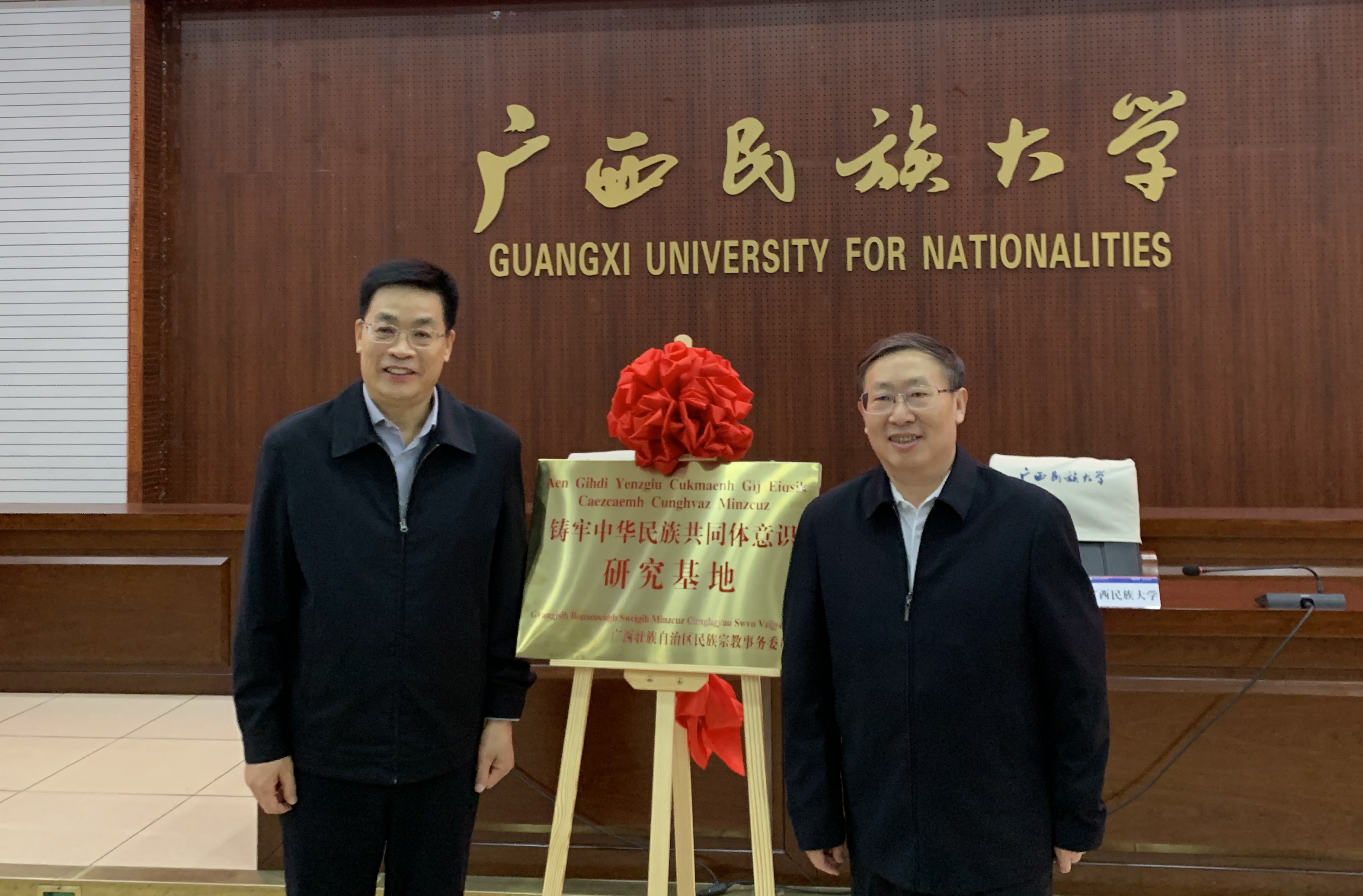 自治区民宗委主任班忠柏(左)、广西民族大学党委书记卞成林(右)共同为“铸牢中华民族共同体意识研究基地”揭牌