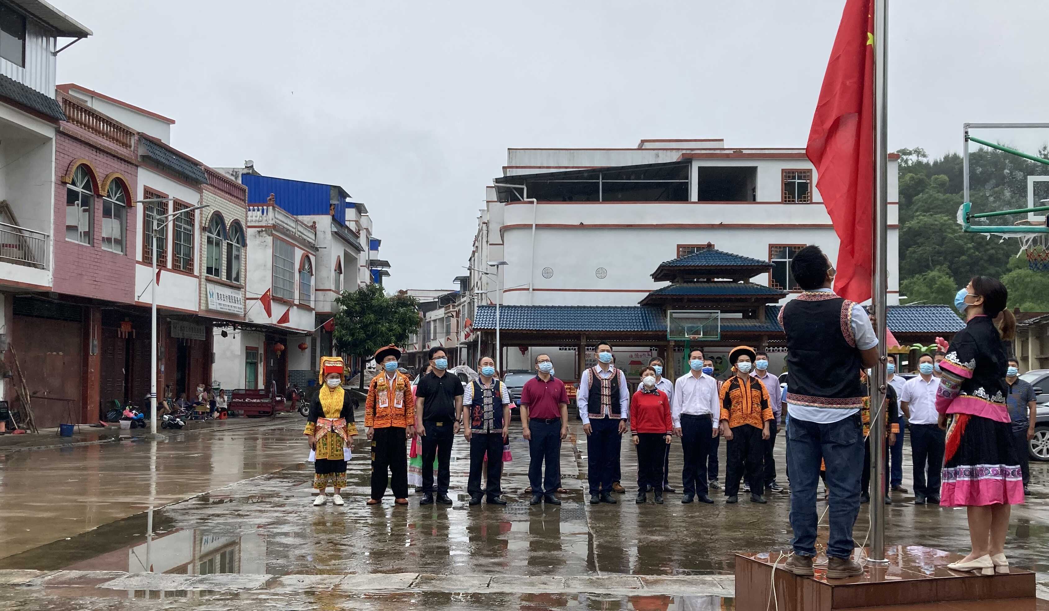 张儒聪(左五)与各族群众一起举行升旗仪式