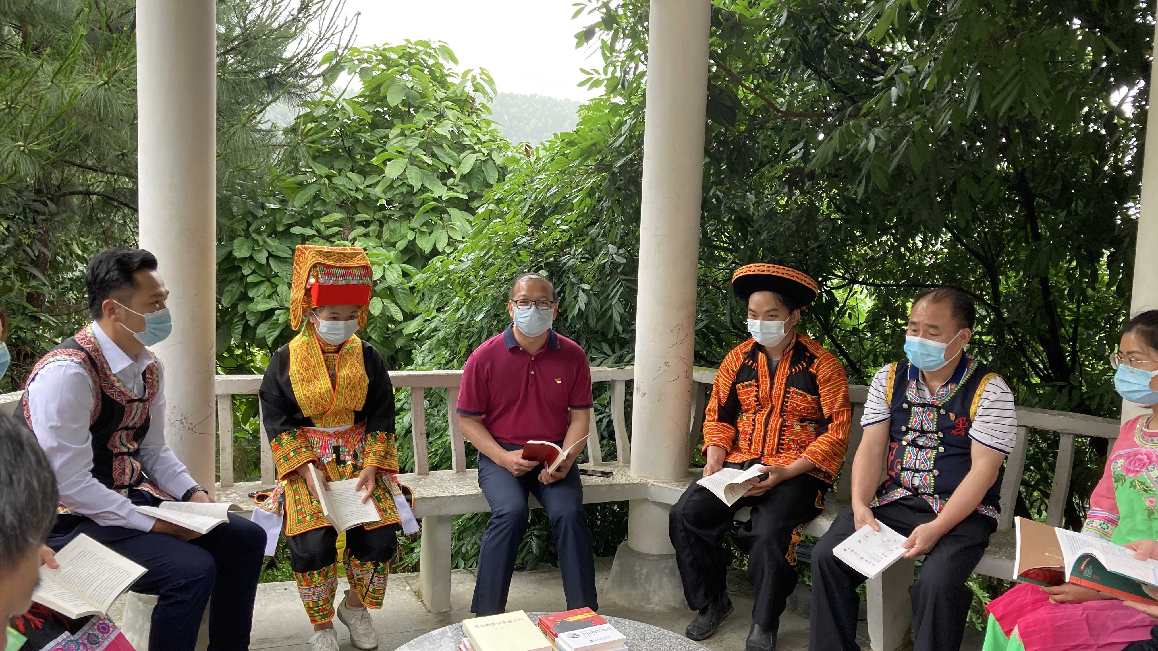 张儒聪(左三)与各族群众一起在凉亭下共话书香