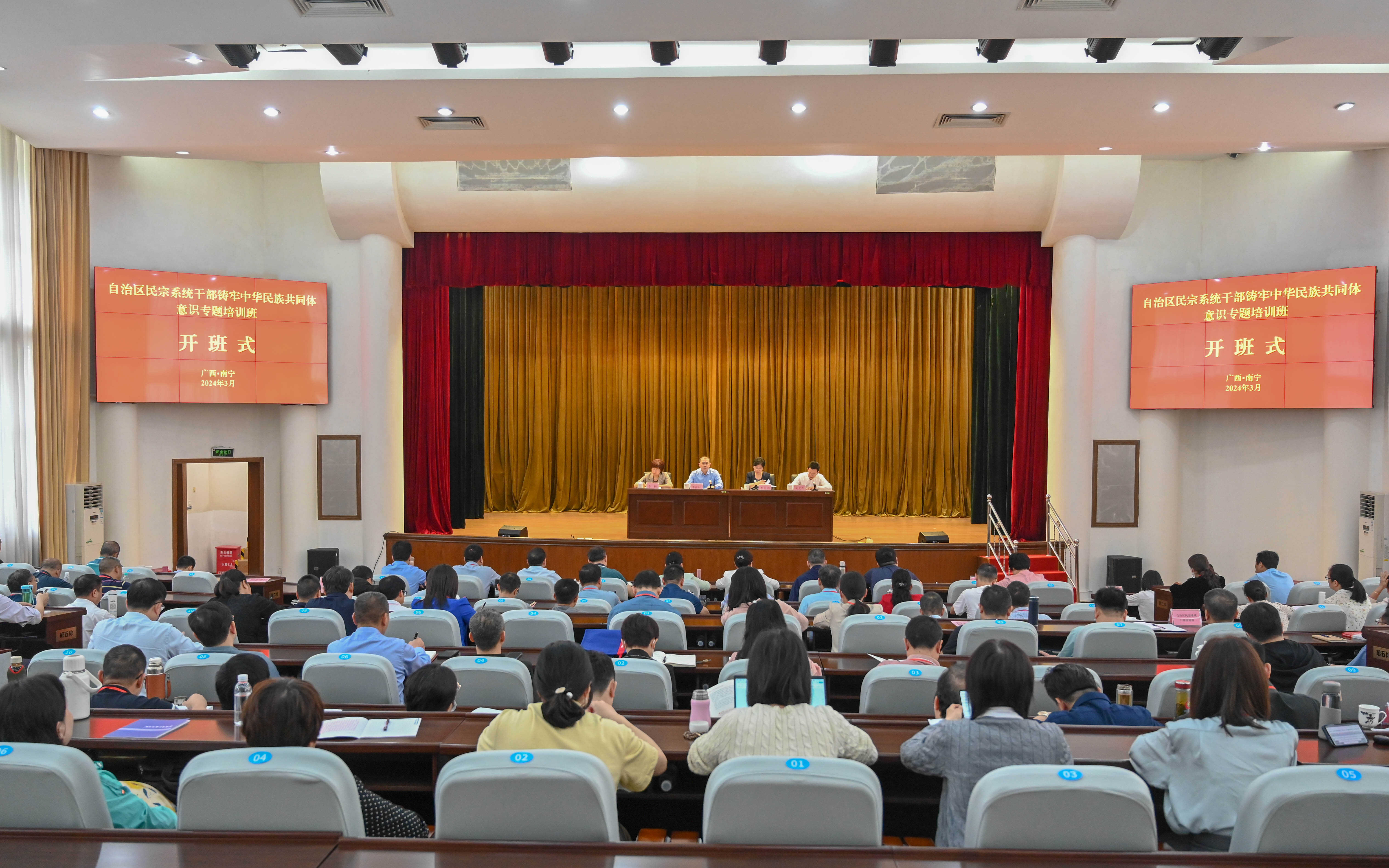 3月25日上午,自治区民宗委在广西社会主义学院举办全区民宗系统干部铸牢中华民族共同体意识专题培训班(第一期)开班式。自治区民宗委党组书记、主任,自治区党委统战部副部长(兼)李振林出席开班式并讲话,自治区党委统战部副部长、广西社会主义学院党组书记李银霞致欢迎词,广西社会主义学院副院长黄龙杰主持开班式。