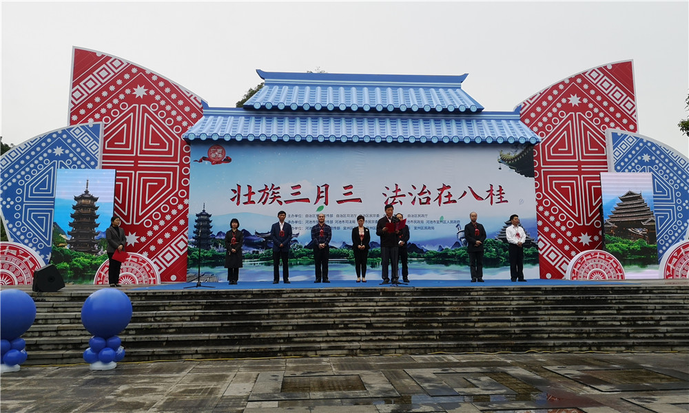 4月13日,由自治区党委宣传部,自治区司法厅、民宗委、教育厅、民政厅联合主办的“壮族三月三 法治在八桂”法治宣传活动启动仪式在河池市宜州区刘三姐音乐喷泉广场举行。自治区党委宣传部,自治区司法厅、民宗委、教育厅、民政厅相关负责同志,河池市和宜州区有关领导出席启动仪式。自治区民宗委二级巡视员余飞出席启动仪式。