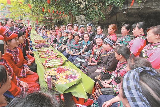 乐业县幼平乡幼里村各族群众欢聚一堂,通过开展民俗表演、品尝传统美食,欢庆“壮族三月三”。王功道摄
