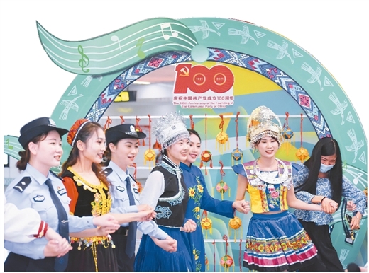 4月14日,在安吉客运站地铁站“壮族三月三”歌圩上,南宁市公安局安吉站派出所民警与各族群众一起载歌载舞。 广西日报记者 何学俏 通讯员 石陈仁健摄