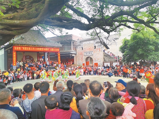 平乐县张家镇各族群众欢聚在千年古榕树下,载歌载舞欢庆“壮族三月三”。苏 桂摄