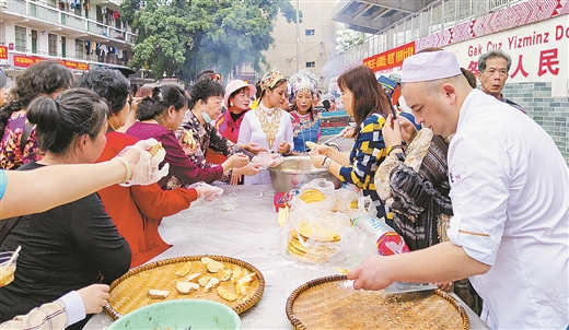 4月13日,中华中路社区开展“壮族三月三·永远跟党走·颂党恩”各族群众大联欢活动。壮族居民用壮乡美食五色糯米饭、艾叶糍粑拼出“庆祝中国共产党成立100周年”字样;来自新疆维吾尔族的买吐送·玉送一家亲手制作了手抓饭、馕饼、烤羊肉串等新疆美食……社区各族群众欢聚一堂,载歌载舞,共同庆祝“壮族三月三”佳节。