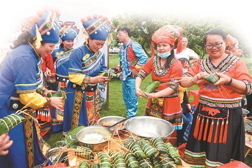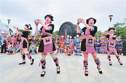 中国鼓、侗族大歌、壮族山歌、苗族民俗……今年“壮族三月三”期间,在南宁市华南城2号广场,民俗文化节活动精彩上演。活动通过婚嫁习俗、歌圩对唱、疍家风俗民俗、抛绣球等民俗文化展演,以及跳竹竿、滚铁环、板鞋竞技等传统民族体育互动,从民俗、音乐、体育、时尚等多个角度展现壮族文化的多姿风情;汇集扬美三宝、柠檬鸭、艾叶糍粑、化皮猪脚等传统美食进行展示展销,让市民从视觉到味蕾全方位体验民族风味的美食、工艺。