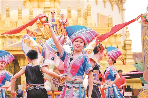 “壮族三月三”假期,南宁方特东盟神话主题乐园举行花船山歌节等多种形式的游客互动活动。广西日报记者周军摄