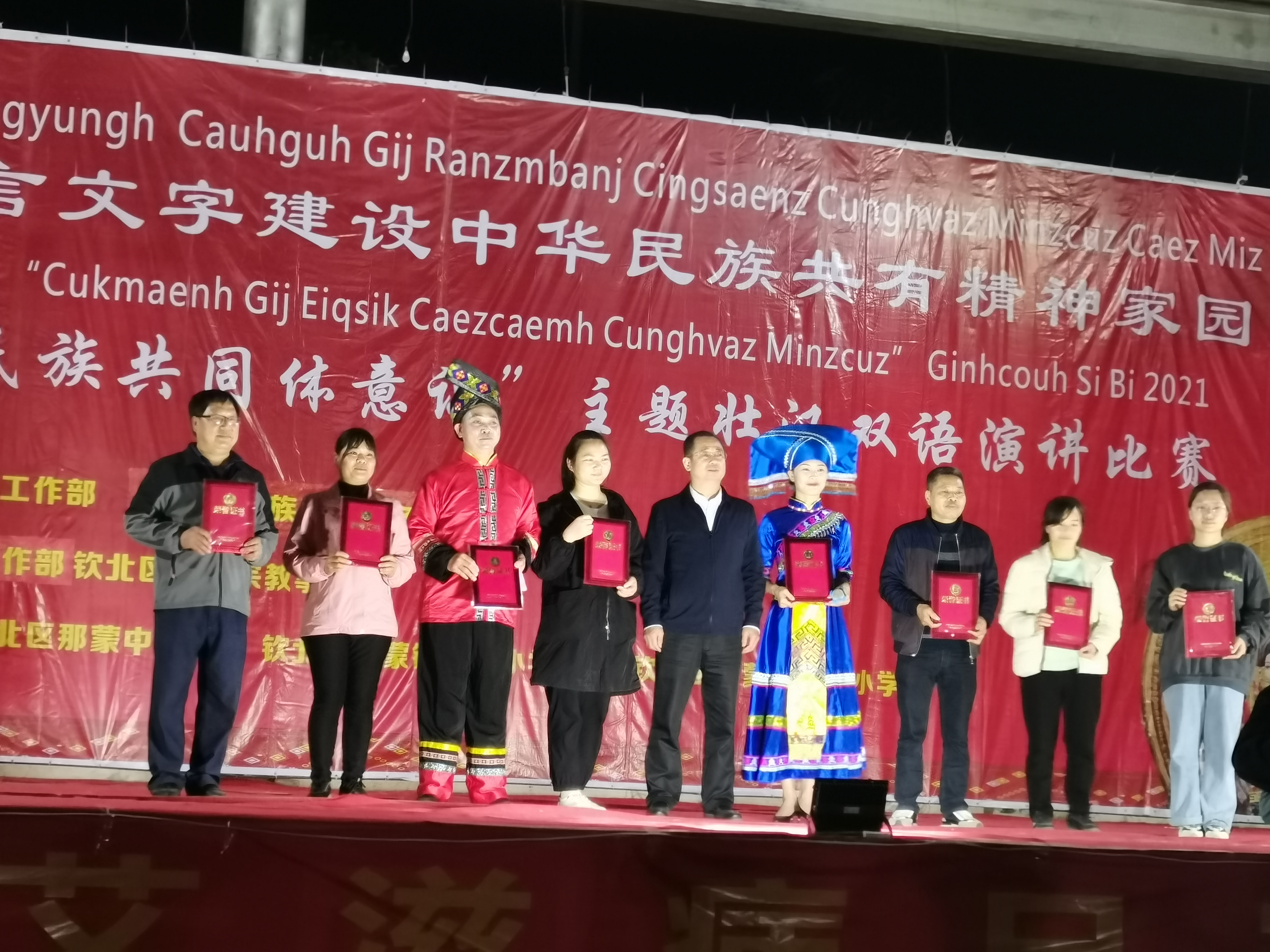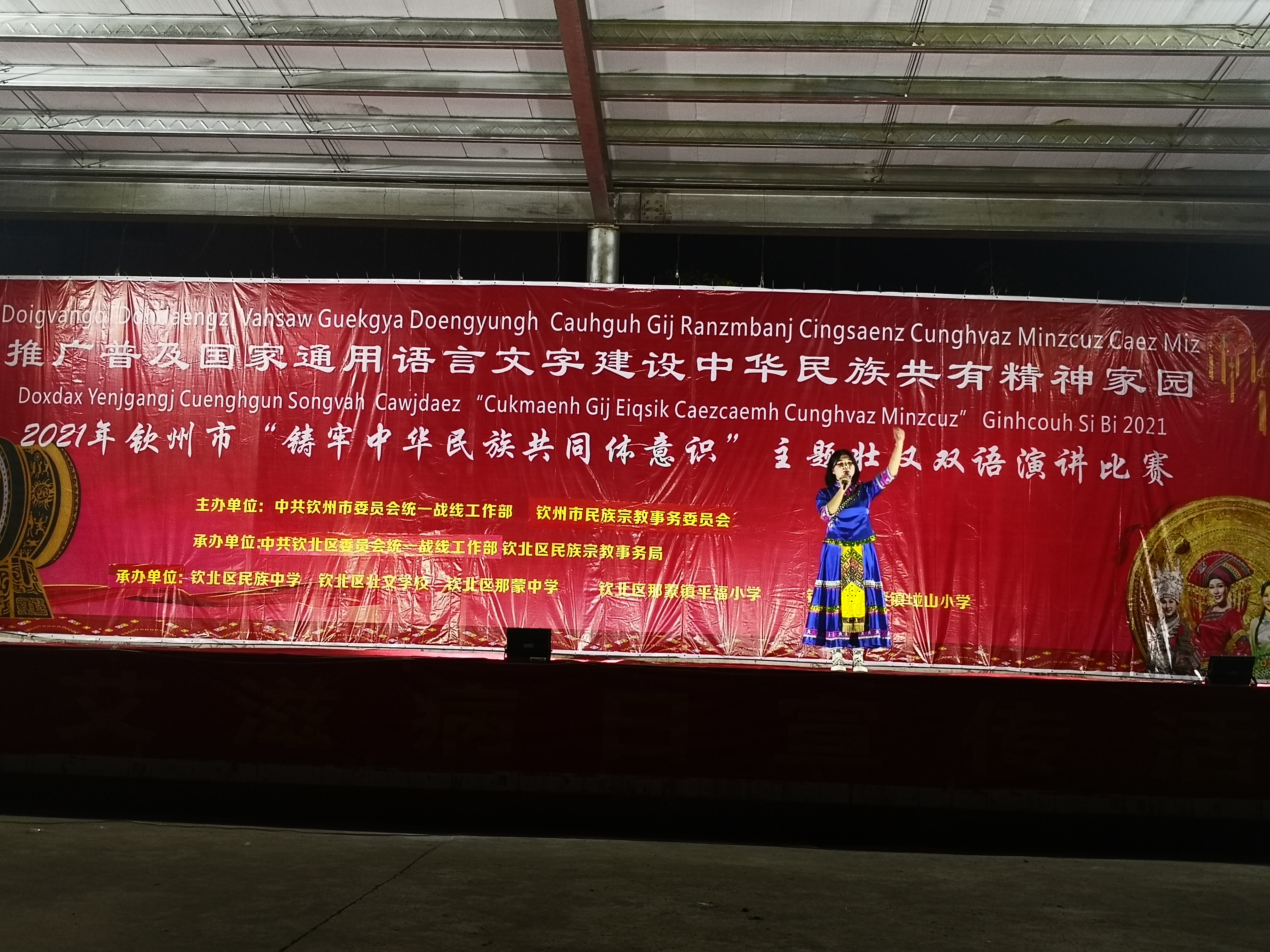为深入学习贯彻习近平总书记关于加强和改进民族工作的重要思想,贯彻落实中央、全区民族工作会议精神,进一步营造民族团结进步创建的浓厚氛围,由钦州市委统战部、钦州市民宗委主办,钦北区委统战部、钦北区民宗局、钦北区那蒙中学等单位承办的以“铸牢中华民族共同体意识”为主题的壮汉双语演讲比赛于12月16日晚在钦北区那蒙中学举行。钦州市民族宗教事务服务中心主任苏开源作致辞,强调要认真学习贯彻中央、全区民族工作会议精神,以铸牢中华民族共同体意识为主线,全面推进民族团结进步创建工作,是当前民族工作的重要任务。希望学校能够加强宣传教育,把铸牢中华民族共同体意识作为一项重要工作谋划好、落实好,大力传承弘扬各民族优秀文化,大力推广普及国家通用语言文字,构筑各民族共有精神家园,举办形式多样的文体活动,促进各族师生员工交往交流交融。参加此次壮汉双语演讲比赛的有钦北区民族中学、钦北区那蒙中学、钦北区壮文学校、钦北区那蒙镇碰山壮文小学、钦北区那蒙镇平福壮文小学有关师生,他们准备了《Son Mwngz Gangj Vahcuengh 教你说壮话》、《盛世中国》、《祖国啊,亲爱的祖国!》、《Duzguk caeuq duzgoep 老虎和青蛙》、《Hingz Go Dinj 短歌行》等26个精彩节目。选手们精神饱满、自信从容、积极昂扬的精神风貌为他们赢得了一阵阵掌声。声情并茂、感情充沛、富有感染力的演讲打动了评委老师以及在场的观众,将现场气氛推向一个又一个高潮。演讲比赛还穿插进行中国共产党党史知识、民族知识竞答活动,同学们热情高涨、自信满满、纷纷踊跃举手回答。经过激烈角逐,最终评选出小学组、中学组的一、二、三等奖。