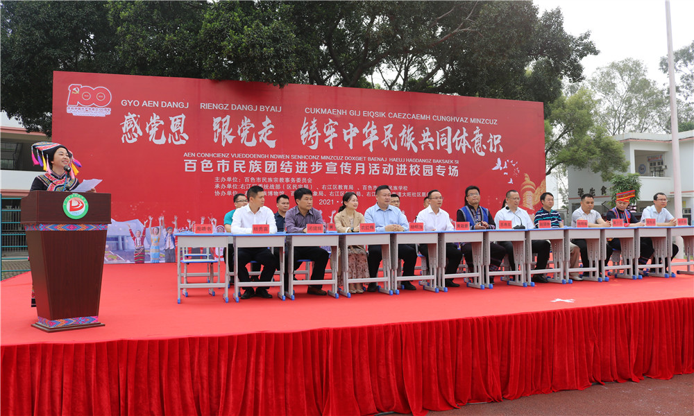 4月13日,百色市民族团结进步宣传月活动在百色市大华民族学校举行。活动由百色市民宗委主办,右江区委统战部(民宗局)、右江区教育局、百色市大华民族学校承办。百色市民宗委、右江区民宗局、教育局,以及百色市大华民族学校共建单位的主要领导及相关负责人出席本次活动。活动以“感党恩,跟党走,铸牢中华民族共同体意识”为主题,通过丰富多彩的民族文化展演和民族美食展示活动,弘扬民族优秀传统文化,增强中华文化的认同感和凝聚力,营造民族团结进步宣传教育的良好氛围,进一步铸牢中华民族共同体意识。师生们以《壮乡儿女心连心,喜迎建党100周年》为开场舞,展示了一系列“中华民族一家亲,同心共筑中国梦”大型文艺节目和民族歌舞。活动中,参演师生们与共建单位演员嘉宾展示了精彩纷呈的民族原生态歌舞表演、舞龙表演、拳术表演、韵律操表演、竹竿舞表演、山歌对唱、壮语歌唱、民族舞蹈、壮剧等多种富有民族特色表演,从民族、民俗、传统、创新各方面融合了民族的多元化特色,展现了各民族民俗风情和优秀民族文化,活动现场充满青春活力、欢声笑语。本次活动还把宣传党的民族政策、传承传统民族文化与节庆活动结合起来,在表演过程中穿插民族政策知识问答环节和民族美食文化制作展示,在场嘉宾、学生和家长们纷纷踊跃参与,充分体现了民族政策深入人心,各民族守望相助、团结进步的社会和谐氛围。