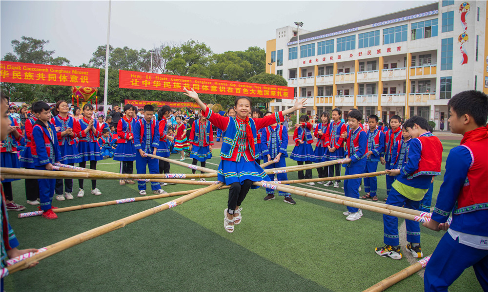 4月13日上午,阳朔县高田镇民族学校成功举办2021年“传承民族文化 促进民族团结”为主题的“壮族三月三”庆典暨第四届少数民族运动会。运动会在民族舞蹈《走在山水间》、独舞《蜻蜓》的展示中拉开了序幕,运动场上一片欢腾。三人板鞋竞速中,一个个动作整齐、步调一致的班级代表队,喊着统一的口令冲向交接区域和终点;滚铁环项目里选手的偶尔脱手,追逐铁环奔跑的紧张模样,引得同学们阵阵开怀大笑;小学部大象拔河的比赛场地上,小小运动员们齐心协力,劲往一处使,胜负久久僵持不下。比赛场上加油助威声此起彼伏、络绎不绝。据悉,2021年高田镇民族学校举行的“壮族三月三”庆典暨第四届少数民族运动会共有3000名师生参加,本届少数民族运动会主要有板鞋竞速、高脚竞速等五个少数民族运动项目。