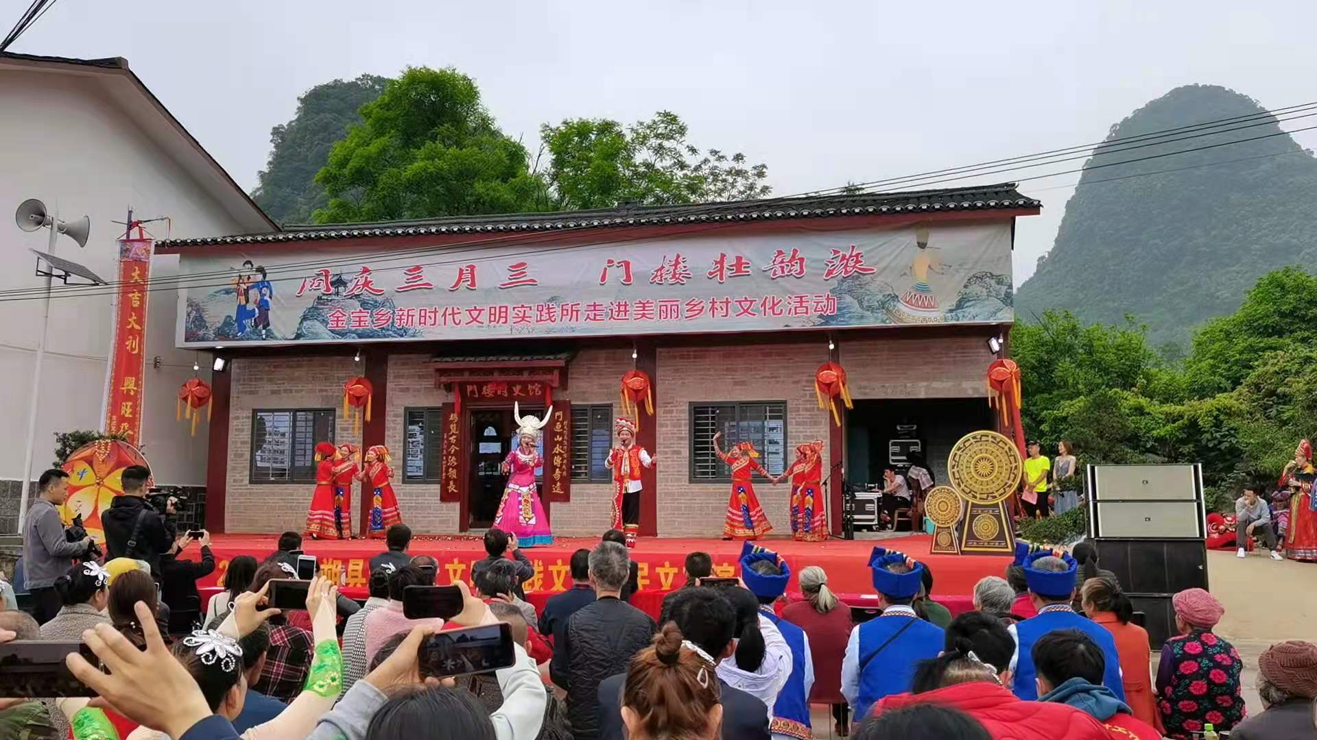 4月13日,阳朔县金宝乡各族群众齐聚该乡门楼村开展“同庆三月三、门楼壮韵浓”主题文化活动暨村史馆揭牌仪式。在民俗节目表演之前,举行门楼村史馆揭牌仪式。为保护民俗遗产,展现历史文明,弘扬门楼民俗文化,实现民俗文化创造性转化、创新性发展,门楼村建立阳朔县首个自然村村史馆,村史馆深入塑造阳朔县金宝乡大利村委门楼村之“魂”,并达到“存史、资政、育人和促进发展”的目的。该馆通过“一位古贤、门前古韵、千古人文、古趣天成、高古遗风、风貌绝古、楼古心赤”七个版块及一大批当地民俗老物件,向世人展现了一幅壮美的门楼村历史人文画卷,让前来参观的人在接受传统民俗文化熏陶、感受传统文明洗礼的同时,还能接受艰苦奋斗的传统文化教育。随后,歌舞《天下阳朔》《大地飞歌》、民歌《对山歌》、建党百年山歌演绎、群众广场舞等,以欢快行走的歌圩、丰富多彩的民族风情、和谐团结的大家庭为主题,集中展示灿烂的民族文化、幸福的生活画面、和美的绿色家园、民族团结的繁荣景象,以及“感党恩、跟党走”的发展情怀。