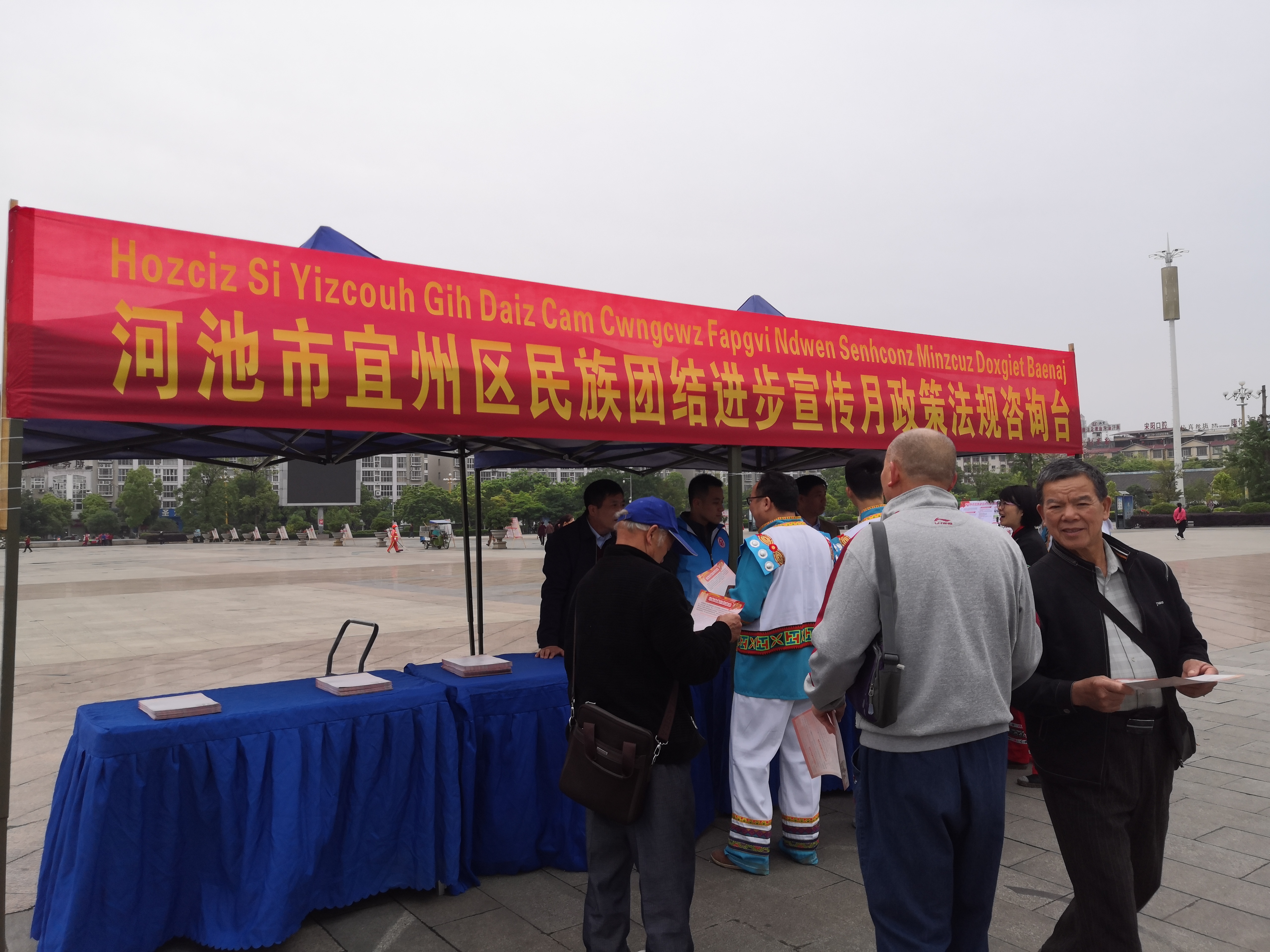 4月13日,2021年宜州区民族团结进步宣传月启动仪式在宜州区市民文化广场举行。通过悬挂系列宣传标语、发放民族政策法规宣传资料、搭建政策法规咨询台等方式,积极引导全区各族人民牢固树立“三个离不开”思想,增强“五个认同”,做到“两个维护”,促进各民族共同团结奋斗,共同繁荣发展。各民族像石榴籽一样紧紧拥抱在一起,不断增强各族群众对伟大祖国、中华民族、中华文化、中国共产党、中国特色社会主义的认同。在全区上下营造了平等、团结、互助、和谐的民族团结进步氛围。