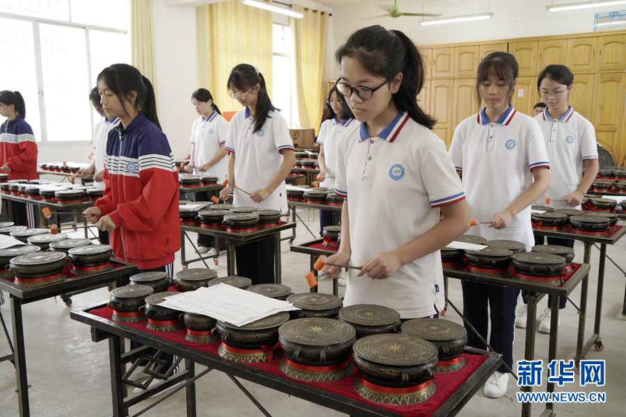 “叮叮咚咚……”一曲清脆的《壮族敬酒歌》从东兰县民族中学一间教室里传出来,引人驻足聆听。14岁的吴锋英和15岁的韦添懿同在这个音乐班学习演奏音乐铜鼓。“我们每周上一节音乐课,不光学壮族歌曲,一些流行歌曲也会学。我是汉族,我觉得音乐铜鼓很好听,挺喜欢的。”吴锋英说。