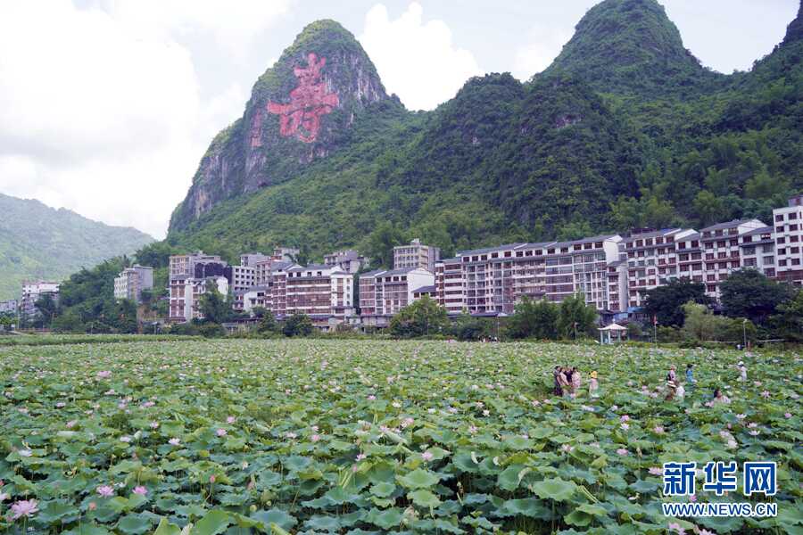游客在巴马瑶族自治县甲篆镇平安村巴盘屯欣赏荷花。